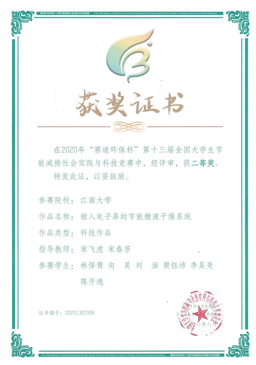 宋飞虎、宋春芳老师指导,过程装备与控制工程系共6位同学(林怿箐、向昊、刘涵、樊钰沛、李昊炎、陈开逸)组成。参赛作品针对干燥产业中制约产品品质提升的焦化和风味散失难题,开发了一种植入电子鼻、融合在线无损检测与过程自动反馈控制技术的微波干燥能系统,该系统可节约能源、提高产品品质。