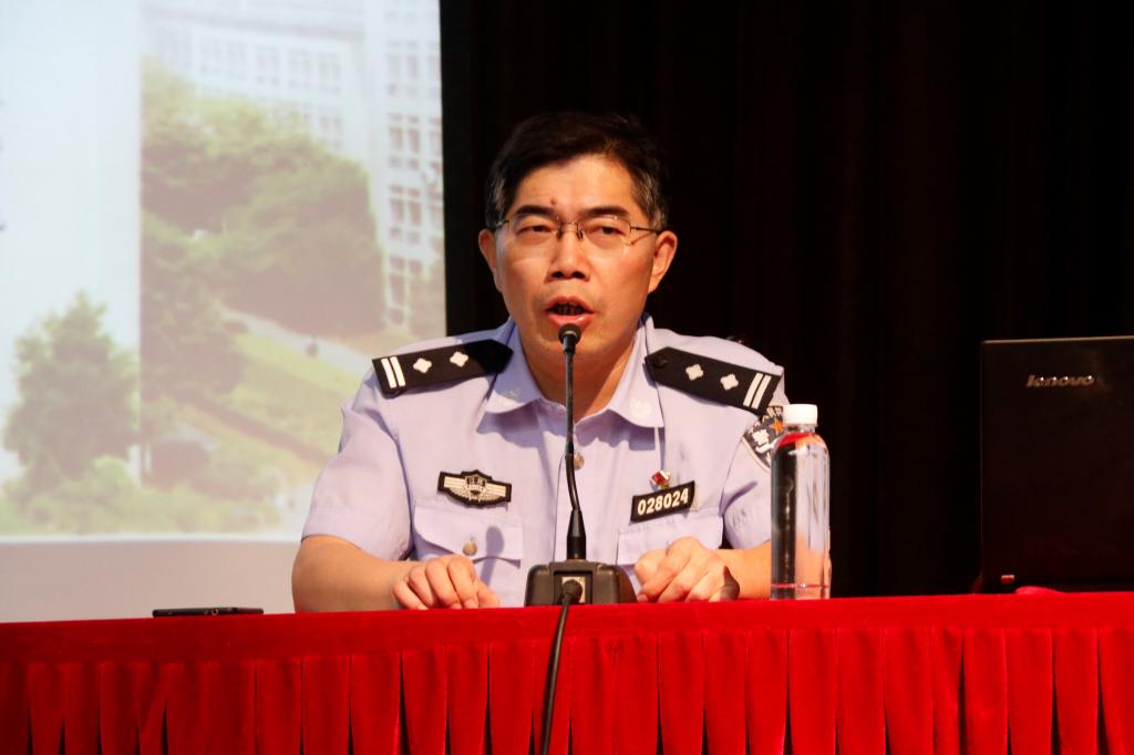 于南区大学生活动中心召开新生安全教育讲座,无锡市滨湖公安分局内保大队大队长沈建华担任主讲,学院2020级辅导员潘智琦主持。