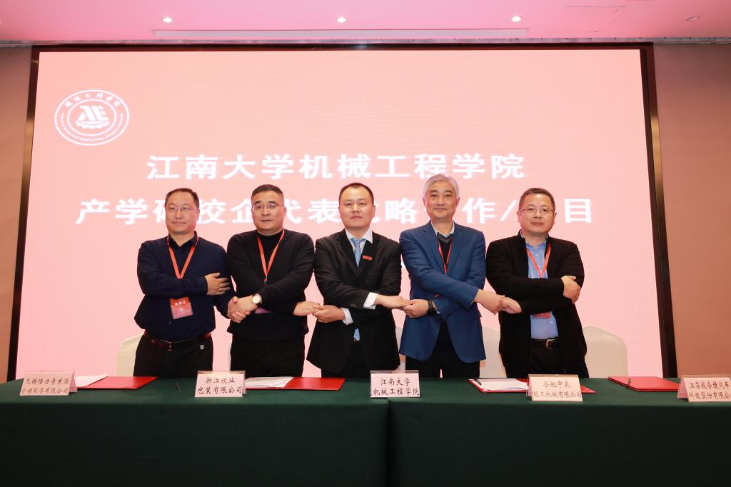 产学研合作项目签约仪式环节,赵军华与合肥中辰轻工机械有限公司、浙江欣业包装有限公司、江苏毅合捷汽车科技股份有限公司、无锡隆力奇东源仓储服务有限公司等校企合作单位代表携手完成签约。