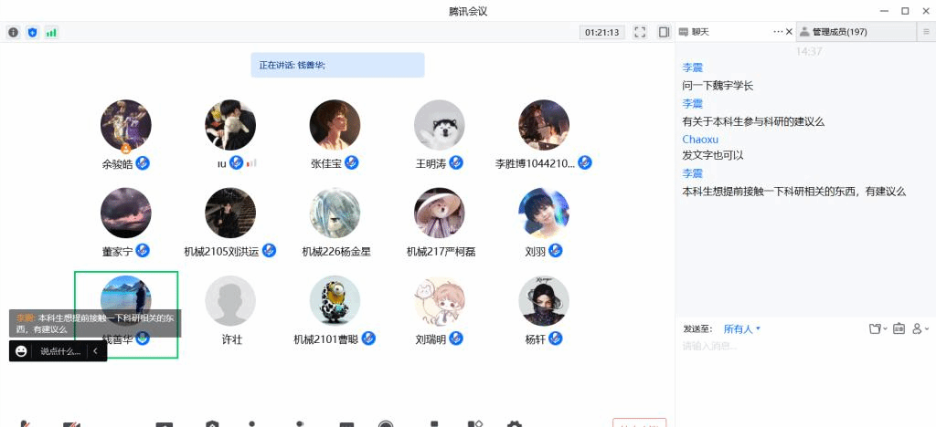 “青春赛道,奋力奔跑”优秀校友经验交流会,本次交流会邀请了我校机械工程专业2007届校友、Eaton Electrical集团亚太区工业工程经理史朝旭,机械工程专业2019届校友、北京理工大学宇航学院博士生魏宇。机械设计与制造系主任钱善华教授、先进制造党支部书记纪小刚副教授、年级辅导员余骏皓、专业教师代表和2021级学生共200多人参加交流会,会议由钱善华主持。