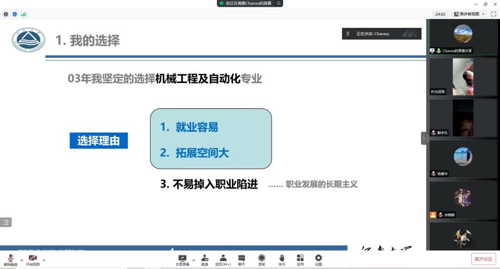 宣传视频开场,向学生介绍了学院本硕博一体化的人才培养体系。史朝旭以“制造即育人”为题,分享其从事机械行业的心得体会:产业升级需要更多技术型制造人才、成功需要知识和实践的双重加持,寄望学生们做好职业规划。魏宇以“学在机械”为主题,分享了他大学期间的课程学习、学科竞赛、读研规划、毕业设计等方面的心得,通过讲述了他大学生创新训练项目日夜奋斗钻研最终发表高水平论文的经历寄语学生珍惜校园时光、做好学业规划、培养自主能力。