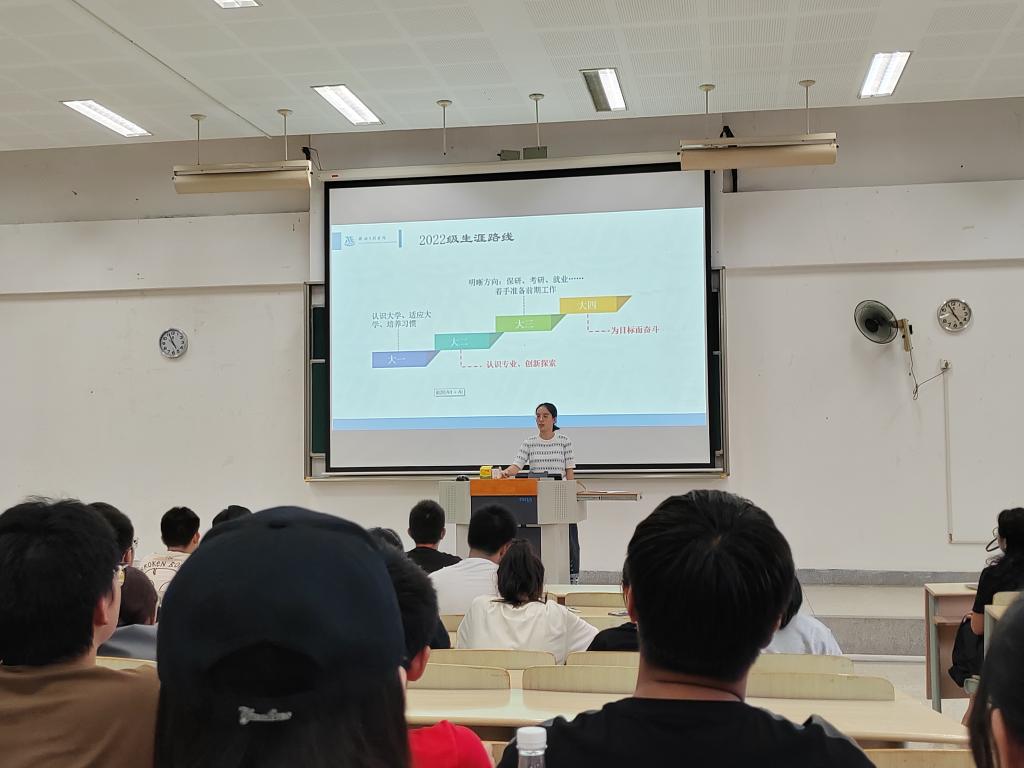在2A127教室开展2022级新生转型教育大会。大会由新生辅导员宋京姝主持,学院教务办沈贤老师、新生辅导员张倩瑶及2022级全体新生参加会议。