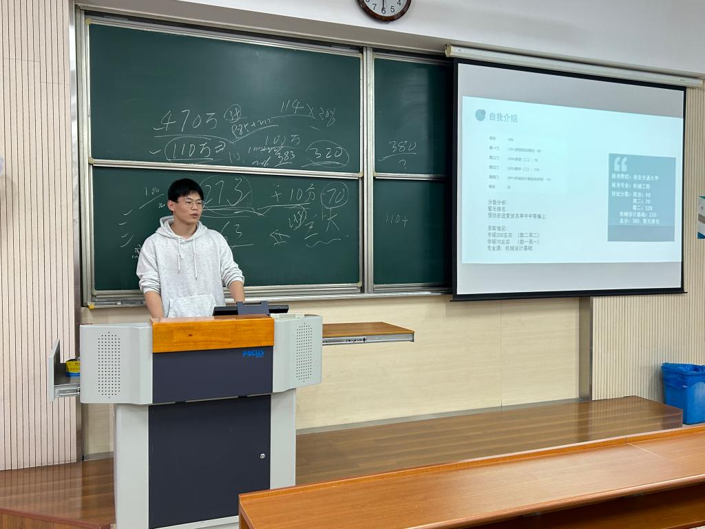 在1A102教室开展“‘研’途有我,全程守护”考研复试经验分享会,会议邀请了对外经济贸易大学硕士、考研全程规划专家程跃进行复试培训,共计51名学生参与,毕业年级辅导员萧欣彤主持本次活动。积极引导并助力学生顺利上岸。