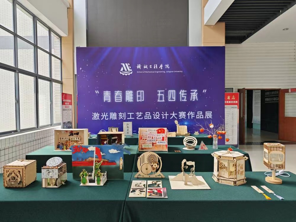激光雕刻俱乐部,面向全校同学开展“青春雕印,五四传承”第八届工艺品设计大赛。学生在五四精神、“四史”学习中感悟精神伟力,感悟青年与社会发展的同频共振,用雕刻的艺术再现历史场景,用鲜活的艺术创造赓续红色血脉、砥砺奋进力量。其中,《缭乱光影》以错落摆放的木板为载体,打造了一个双面成像视错觉装置,通过向特定的角度投射光线,分别呈现出鲁迅先生和举着五四旗帜的两位青年的剪影;《更迭》以守序的时代、奋进的时代和昂扬的时代为主题,浓缩展现中国自五四运动后的发展历程;《跨越时空的对话》通过两侧分别呈现105年前五四运动青年学生走出学堂以及新时代青少年高举红旗向前辈奔跑的场景,寓意新时代青年牢记五四运动中前辈们的英勇付出,在全面建设社会主义现代化国家新征程中挺膺担当,奋勇争先。