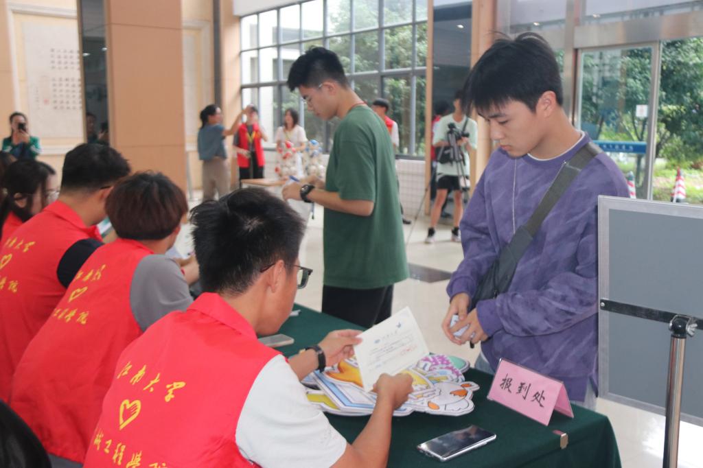的新生和家长拖着4个行李箱,由高年级学长组成的志愿者忙撑着伞上前,帮助他们把行李搬上九楼,安放在寝室里。“整个报到流程非常顺利,我来报到时,辅导员和副班们也早早就在报到处等待大家,学长学姐非常热情,学院的安排很周到。”住在34号楼907寝室的新生石瀚文说,因为辅导员和副班几天前就在群里向新生详细讲解了现场报到的注意事项,他和室友都已经完成报到,顺利入住。每一次“搭把手”,暖心相助,让每一位机械人顺利入住新的“小家”。