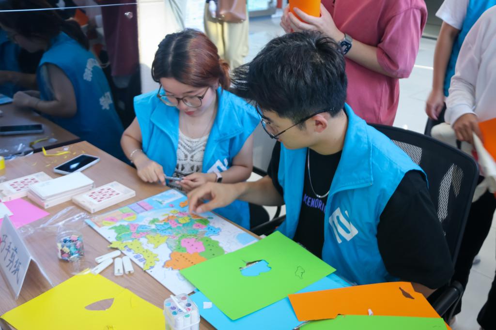 翰墨抒怀,礼赞祖国。在工作人员的指导下,同学们在拼图上选择自己家乡的省份,用彩色卡纸描绘并裁剪,将其贴在作品展示板上,并在空白区域写上对祖国、对家乡的祝福。镜头前,家乡的美食美景是学生如数家珍的回忆,侃侃而谈中无一不是对家乡的思念与热爱。活动现场还设置了贺卡祝福环节,彩带上的一张张贺卡承载了同学们对祖国深深的祝福与当代青年的责任担当。《醒狮》等书画作品更是同学们情感的载体,展现了对祖国母亲的永恒情谊。